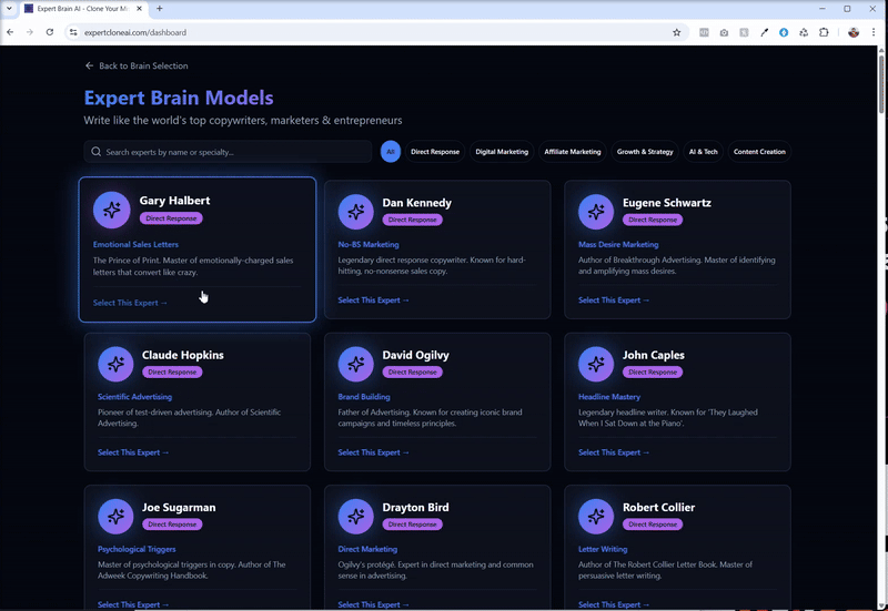 Each expert brain is pre-loaded with their unique voice, persuasion patterns, and conversion strategies.